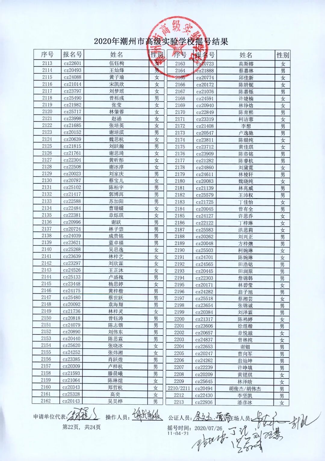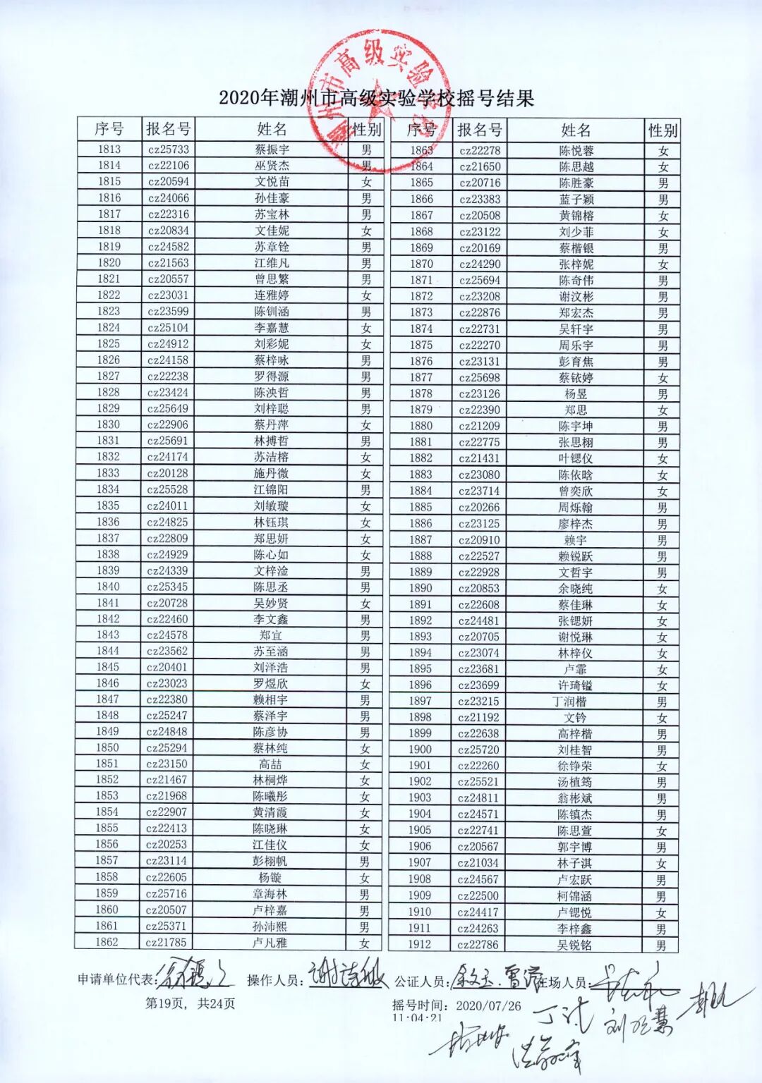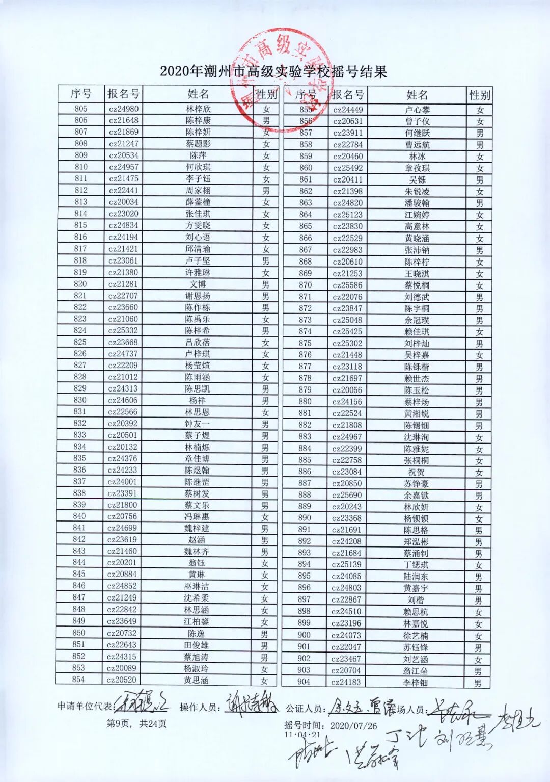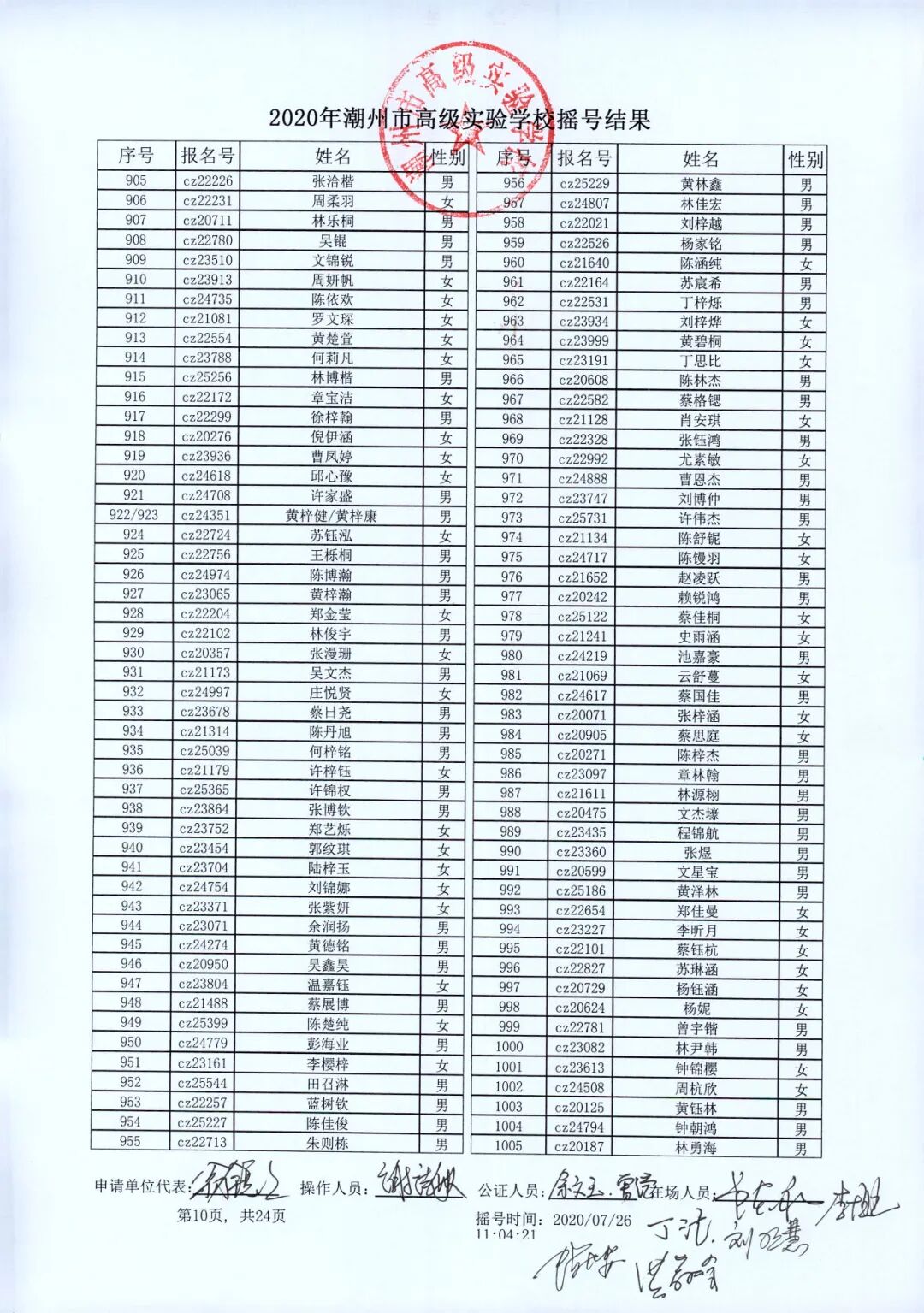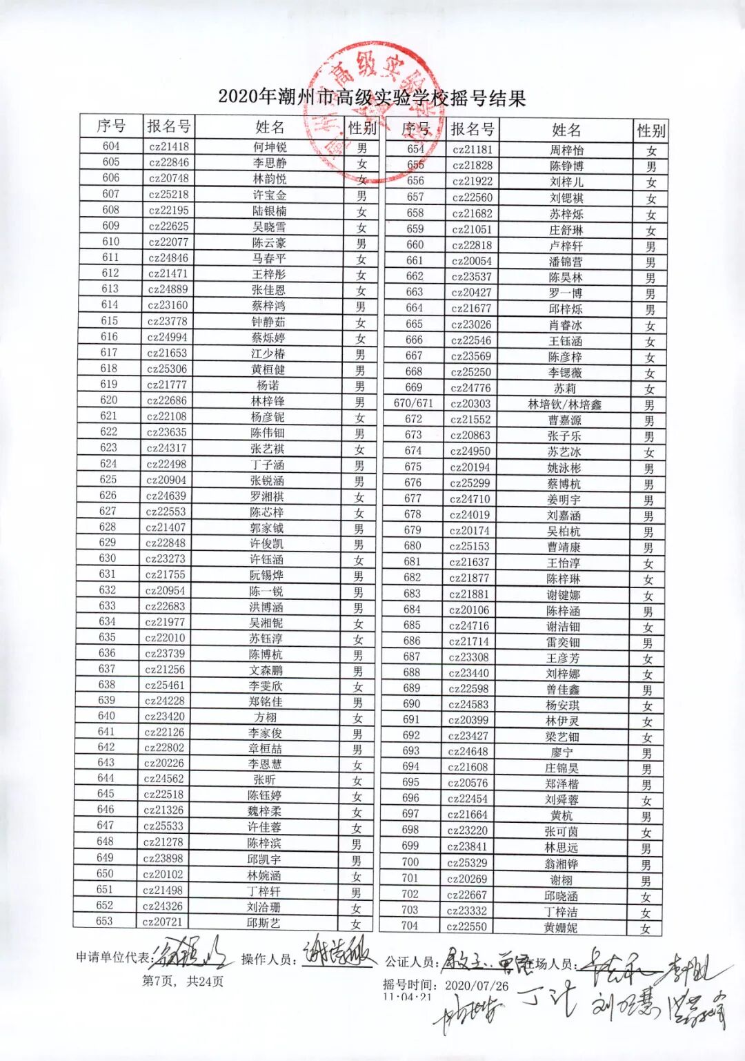潮州市高级实验学校2020年摇号招生结果公布暨新生注册通知